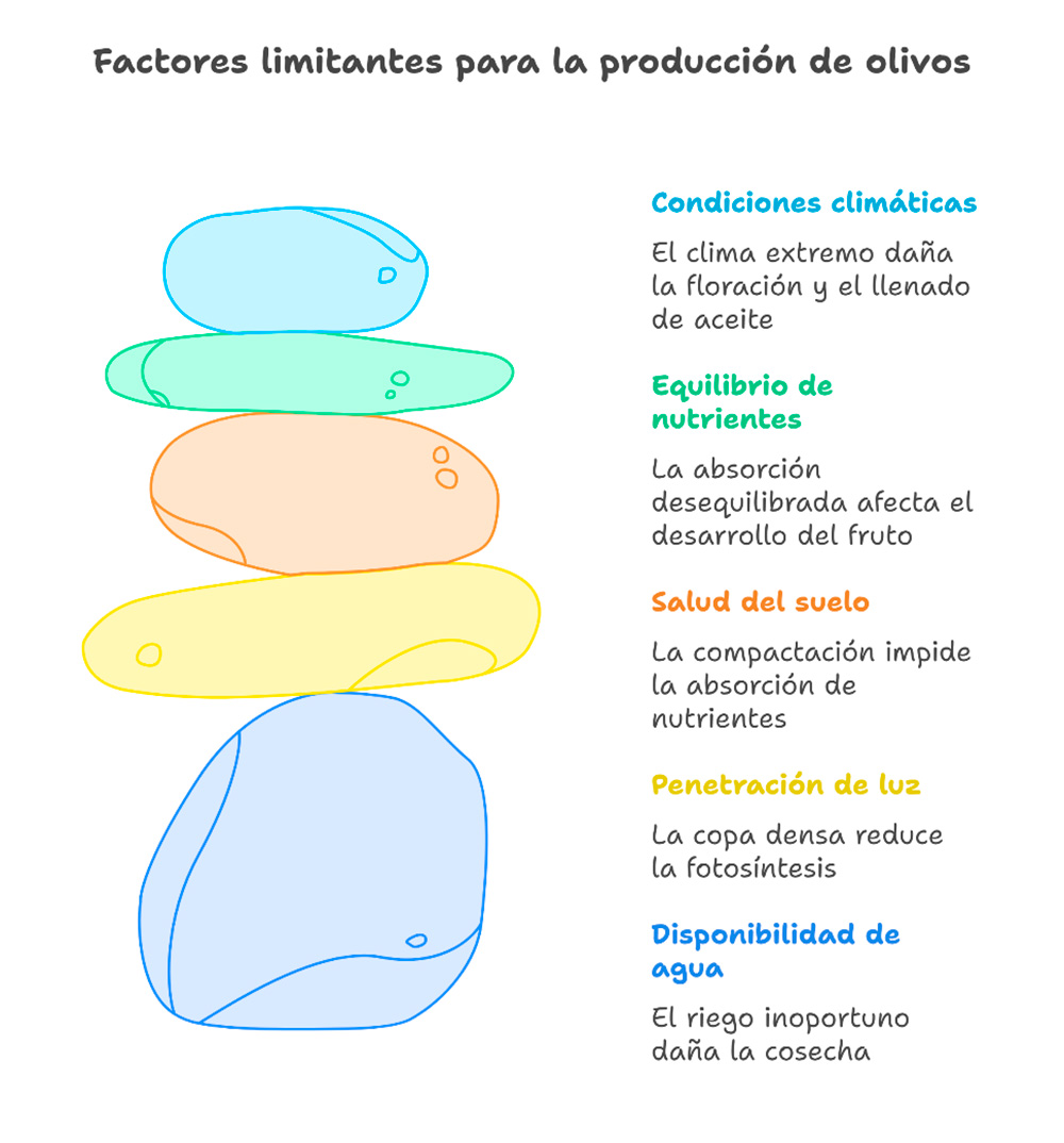 Producir es otra cosa: es que el olivo decida invertir energía, nutrientes y agua en formar flor, cuajar fruto y llenarlo de aceite. Para que eso ocurra, deben alinearse cinco factores: agua, luz, suelo, nutrientes y clima… justo en los momentos fisiológicos clave.