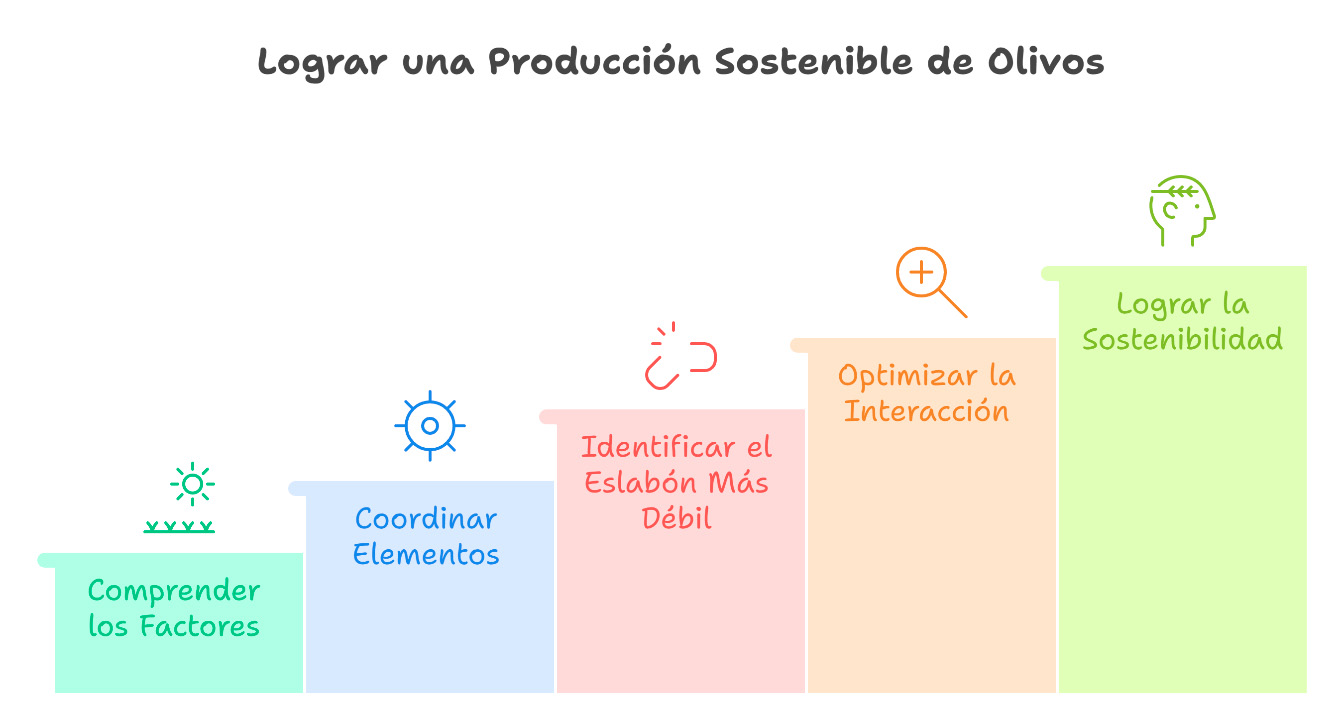 El olivar es un sistema complejo donde cada elemento está conectado. Funciona bajo la lógica del eslabón más débil: si uno de estos factores falla, el rendimiento se resiente, a veces de forma drástica.