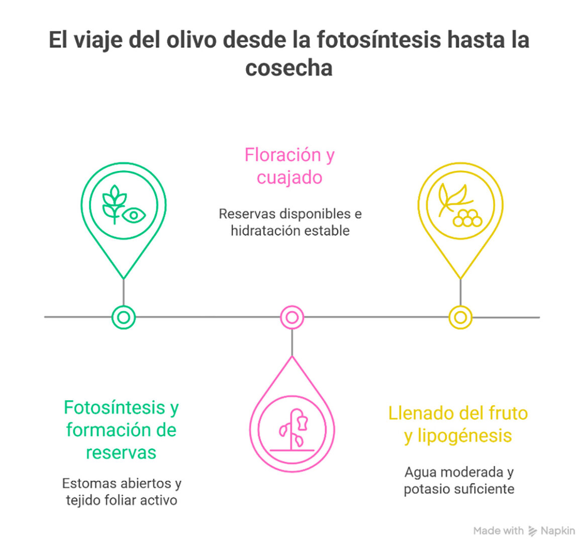 Un olivo no produce solo porque se riegue o porque el suelo sea fértil. Tampoco basta con aportar fertilizantes. La producción llega cuando agua, luz, suelo, clima y nutrición trabajan de forma coordinada a favor del árbol.